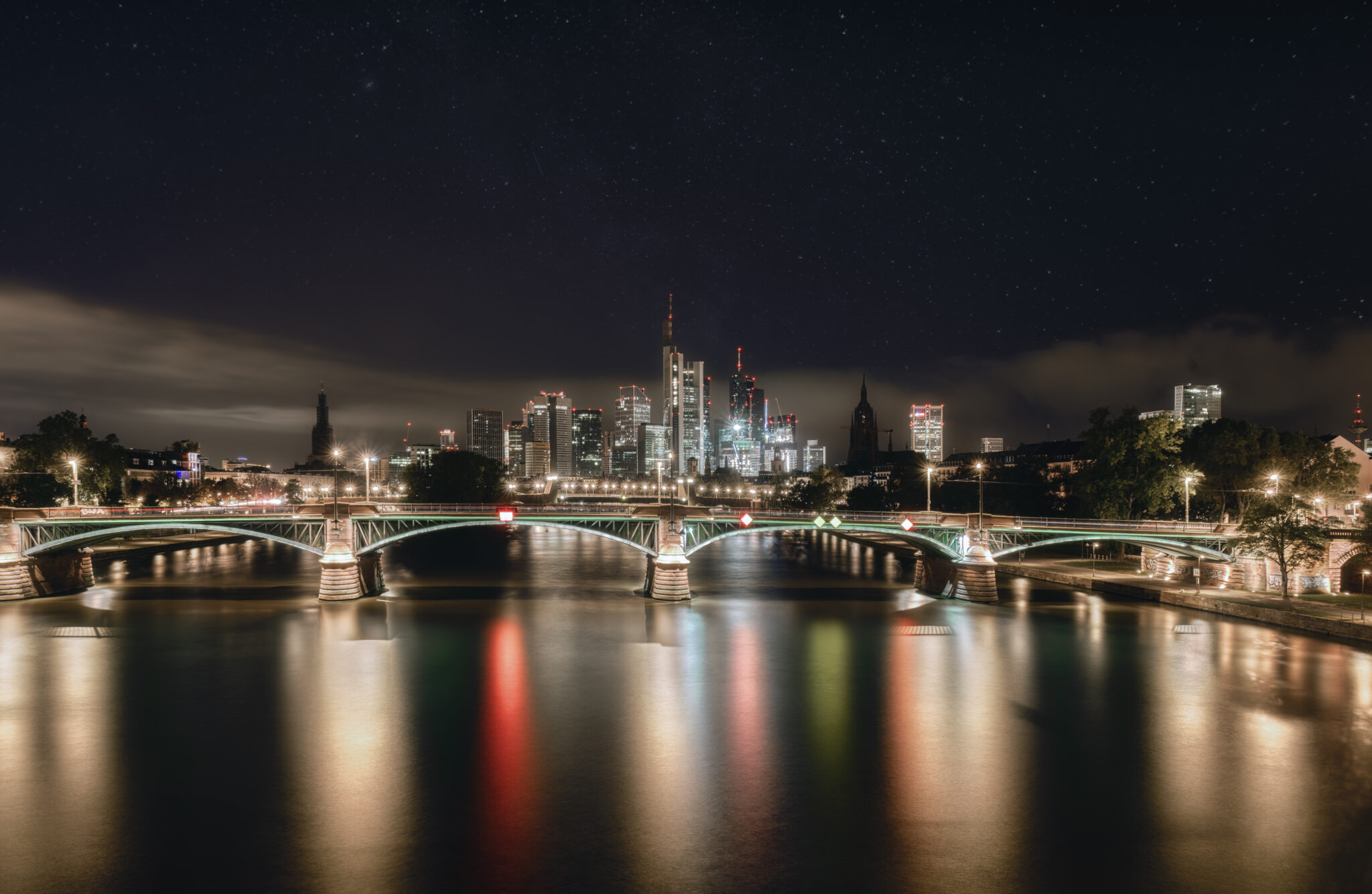 Wir waren nicht allein. Ein paar andere Nachtschwärmer hatten den gleichen Gedanken gehabt: Kameras, Stative, Menschen, die einfach nur schweigend in die Dunkelheit schauten. Autos rollten gedämpft über die Brücke, am Ufer hörte man das gleichmäßige Plätschern des Wassers. Frankfurt wirkte in diesem Moment zurückhaltend – und gerade deshalb so eindrucksvoll.