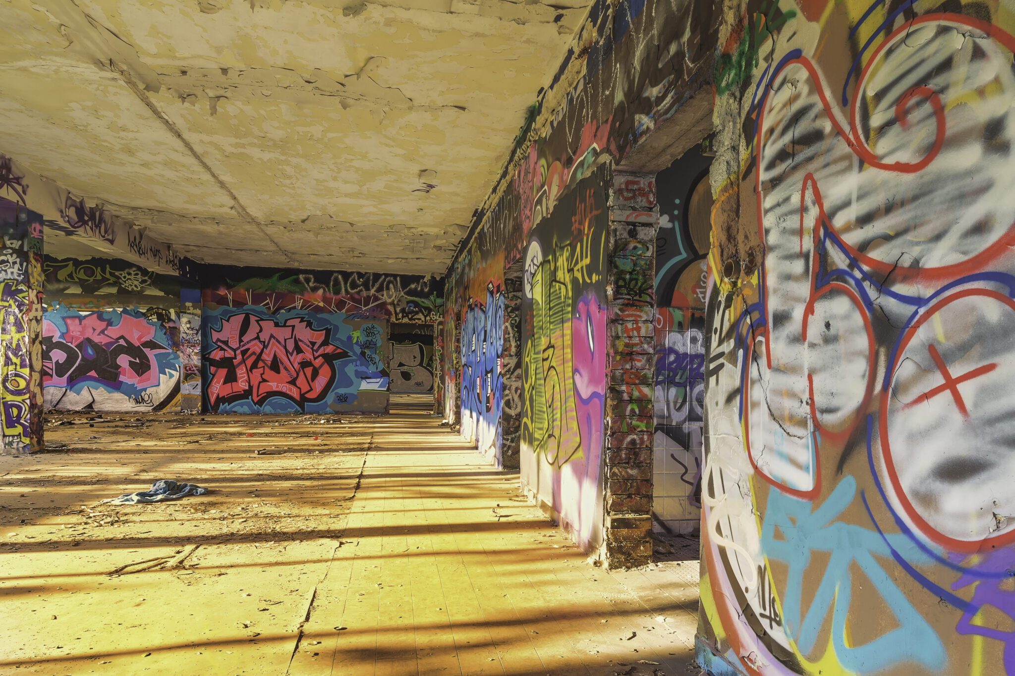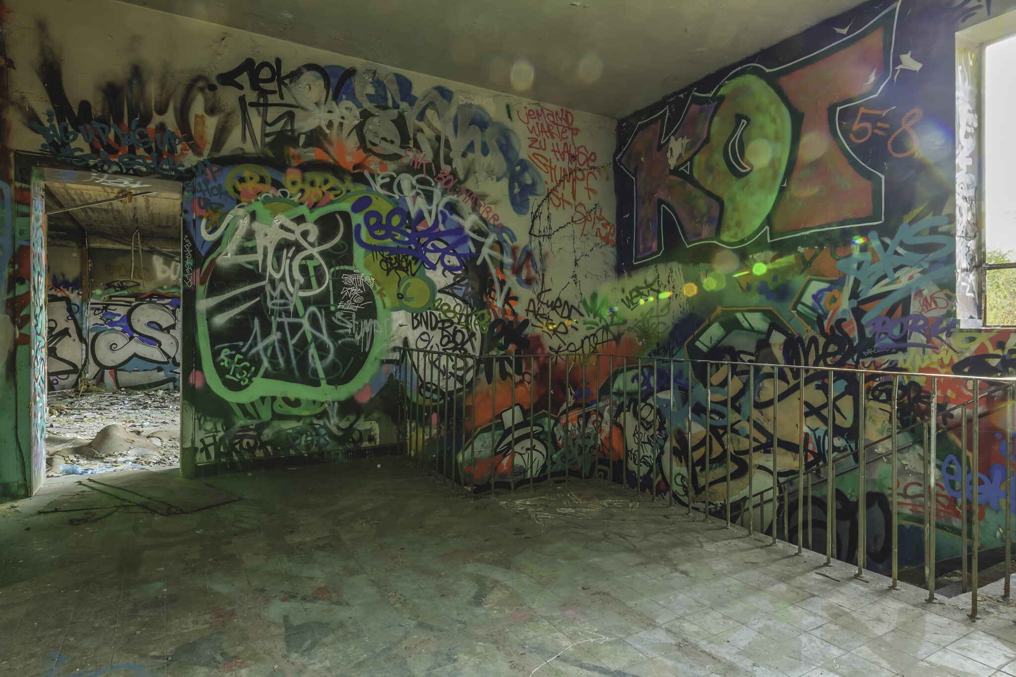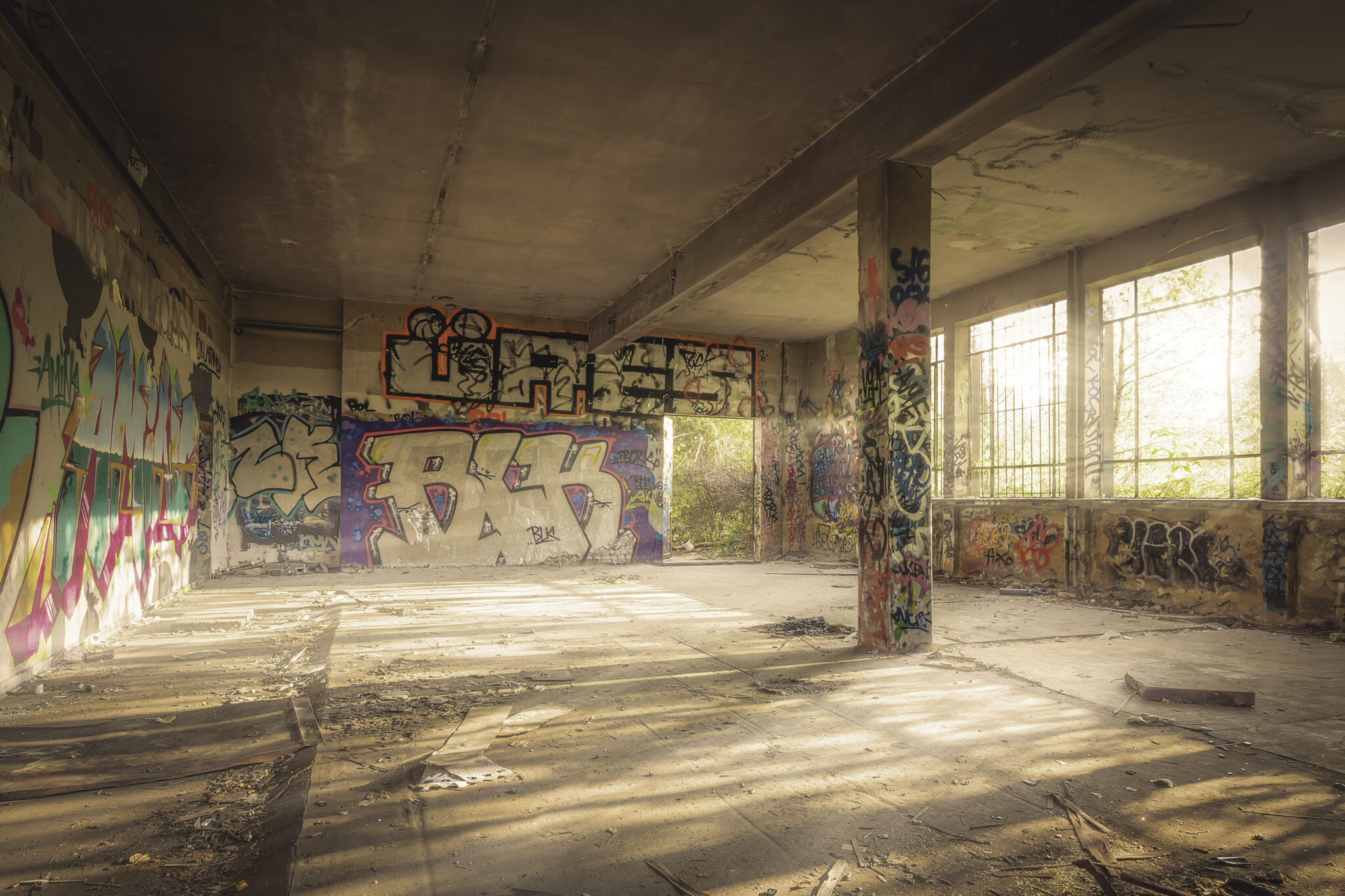 Der Tag meines Besuchs war von einem goldenen Herbstlicht geprägt. Die Sonne stand tief, und die langen Schatten der zerfallenden Mauern und gesprungenen Fenster sorgten für eine dramatische Atmosphäre. Das Wetter war sonnig mit warmen Temperaturen für einen Oktobertag. Ein leichter Wind bewegte die Blätter, und das goldene Licht der tiefstehenden Sonne sorgte für eine fast surreale Atmosphäre in den verlassenen Hallen. und trug das Rascheln der umherfliegenden Blätter mit sich.