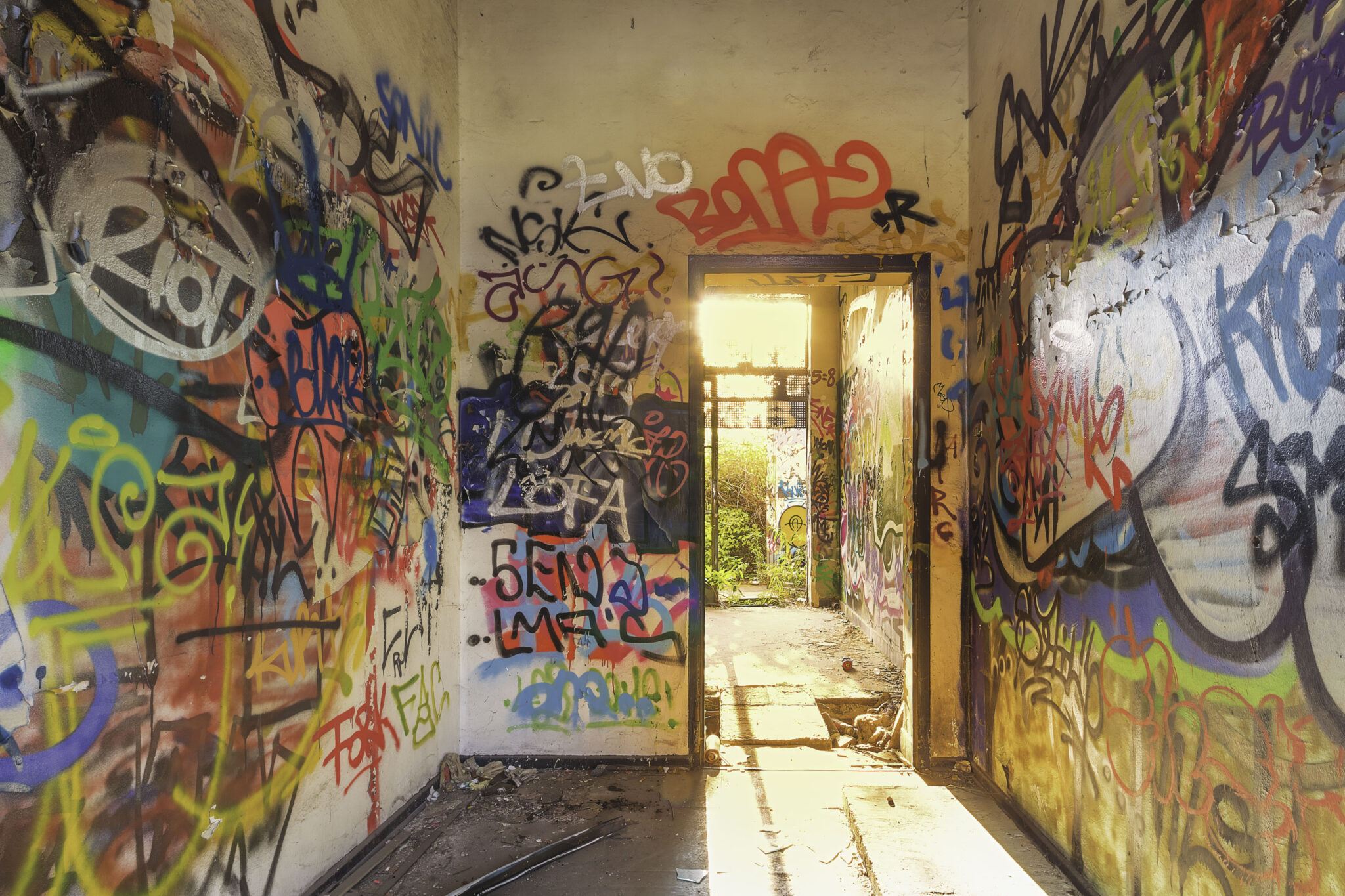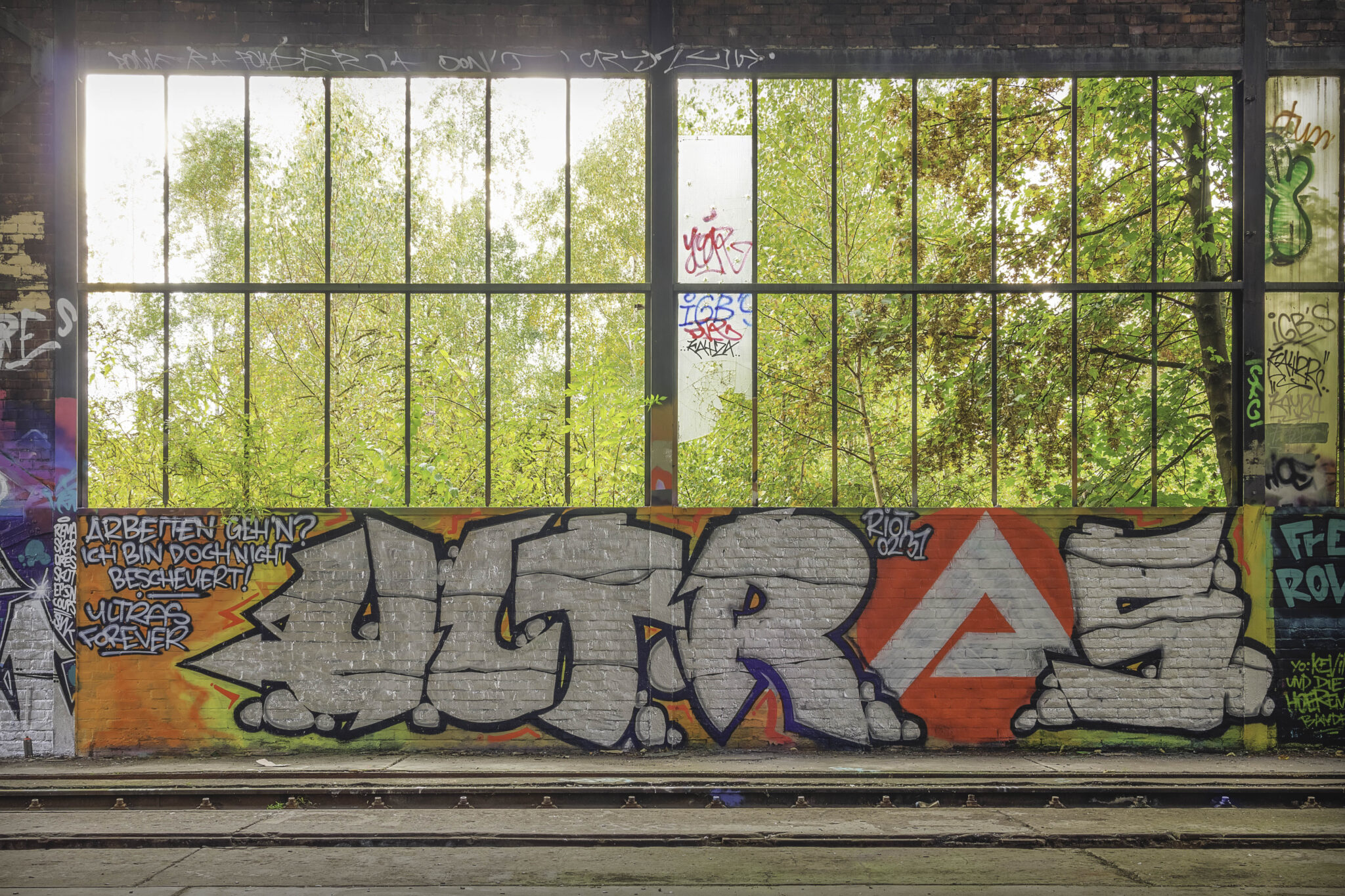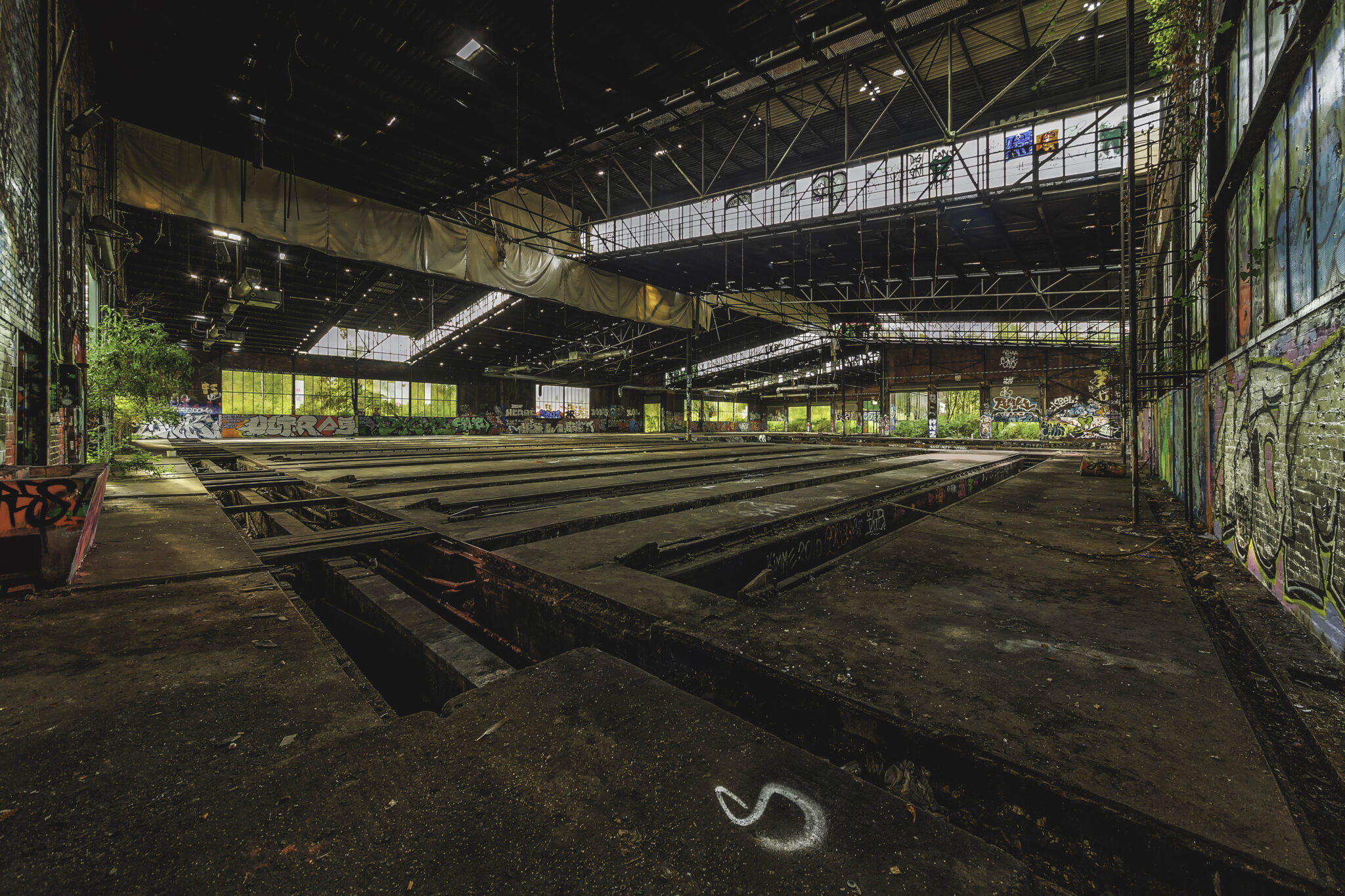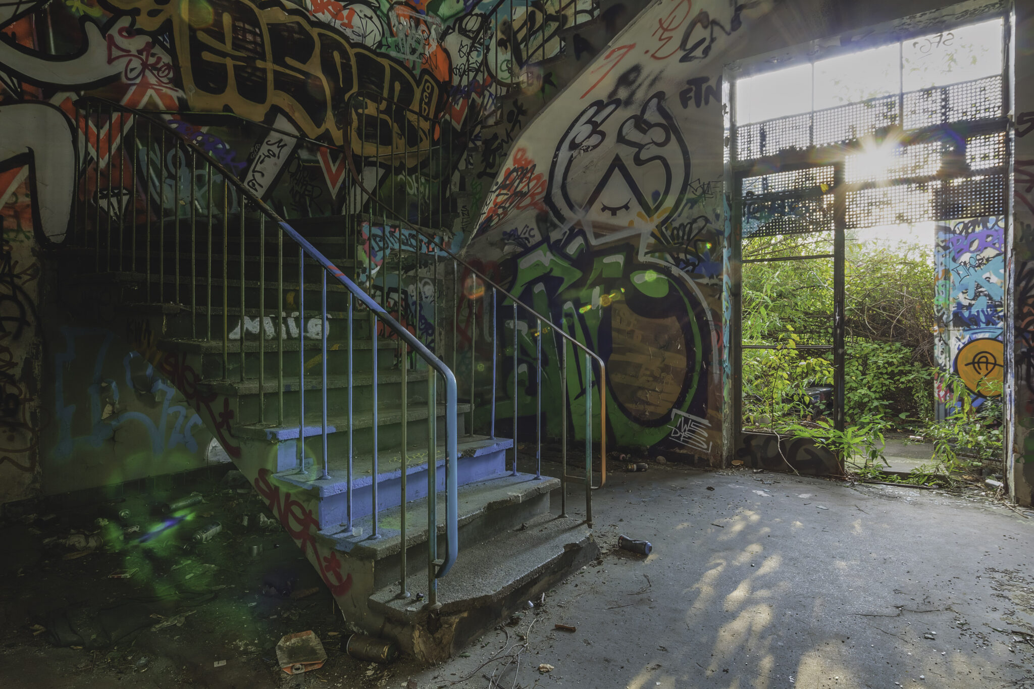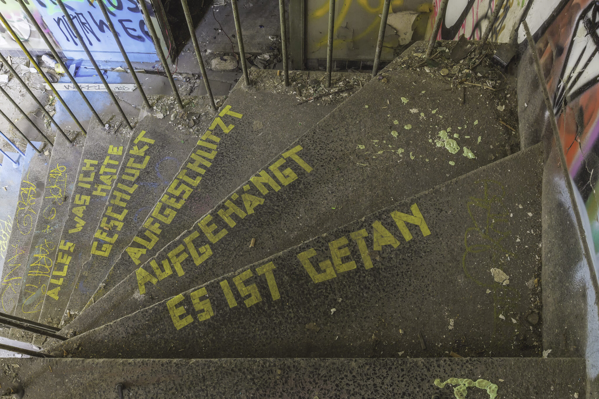 Die Hallen sind heute eine farbenfrohe Sammlung unterschiedlichster Graffiti-Kunstwerke, die die Geschichte des Ortes auf künstlerische Weise widerspiegeln. Neben abstrakten Motiven finden sich auch Darstellungen historischer Elemente der Eisenbahn und des Bahnbetriebs. Einige sind kunstvoll gestaltet, andere eher simple Schmierereien. Besonders auffällig war eine Treppe mit gelber Schrift, die eine markante Botschaft trug: “Alles, was ich hatte, geschluckt, aufgehängt, aufgeschützt. Es ist getan.” Ein bedrückendes Mahnmal oder einfach nur poetische Worte?