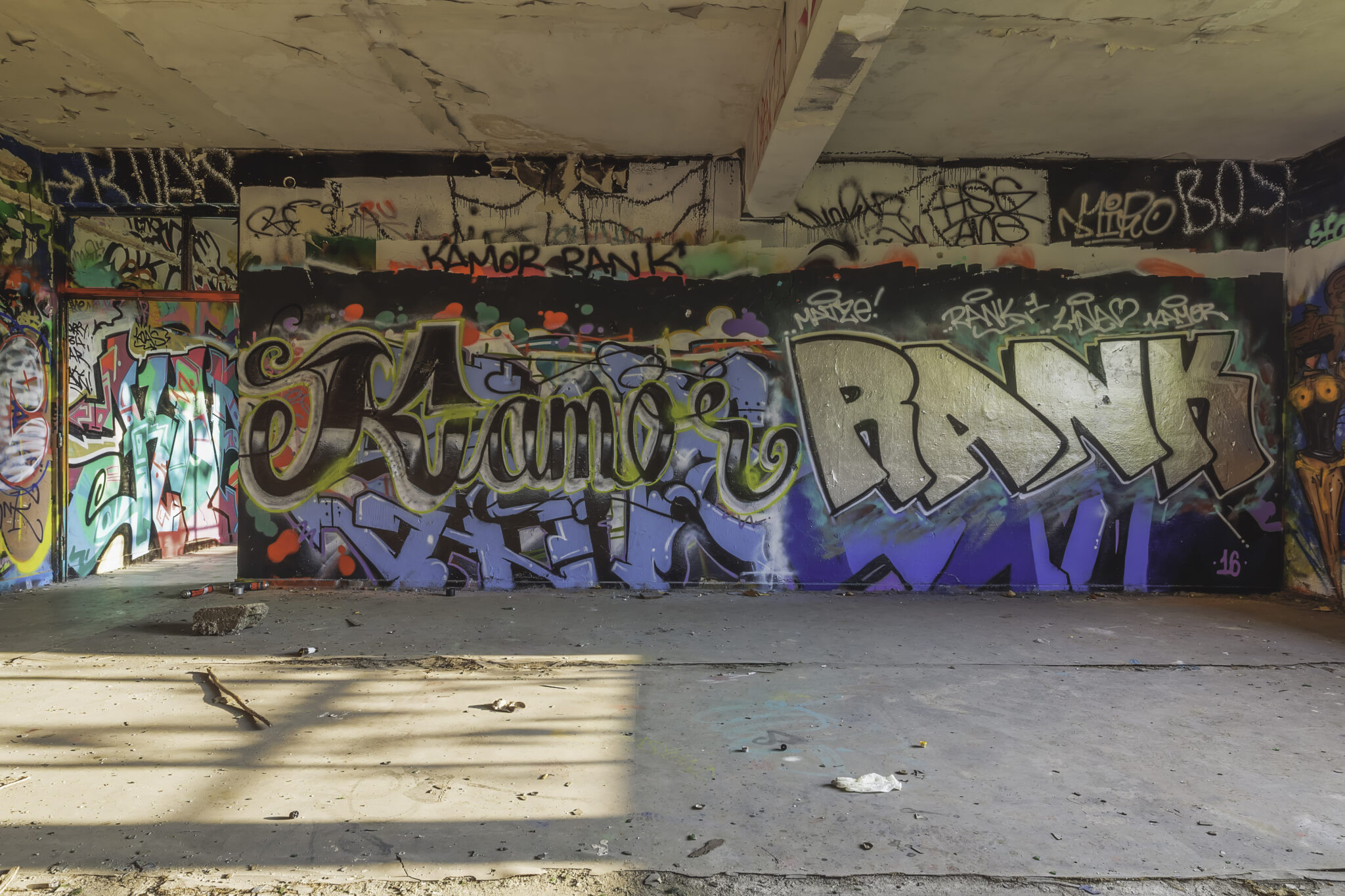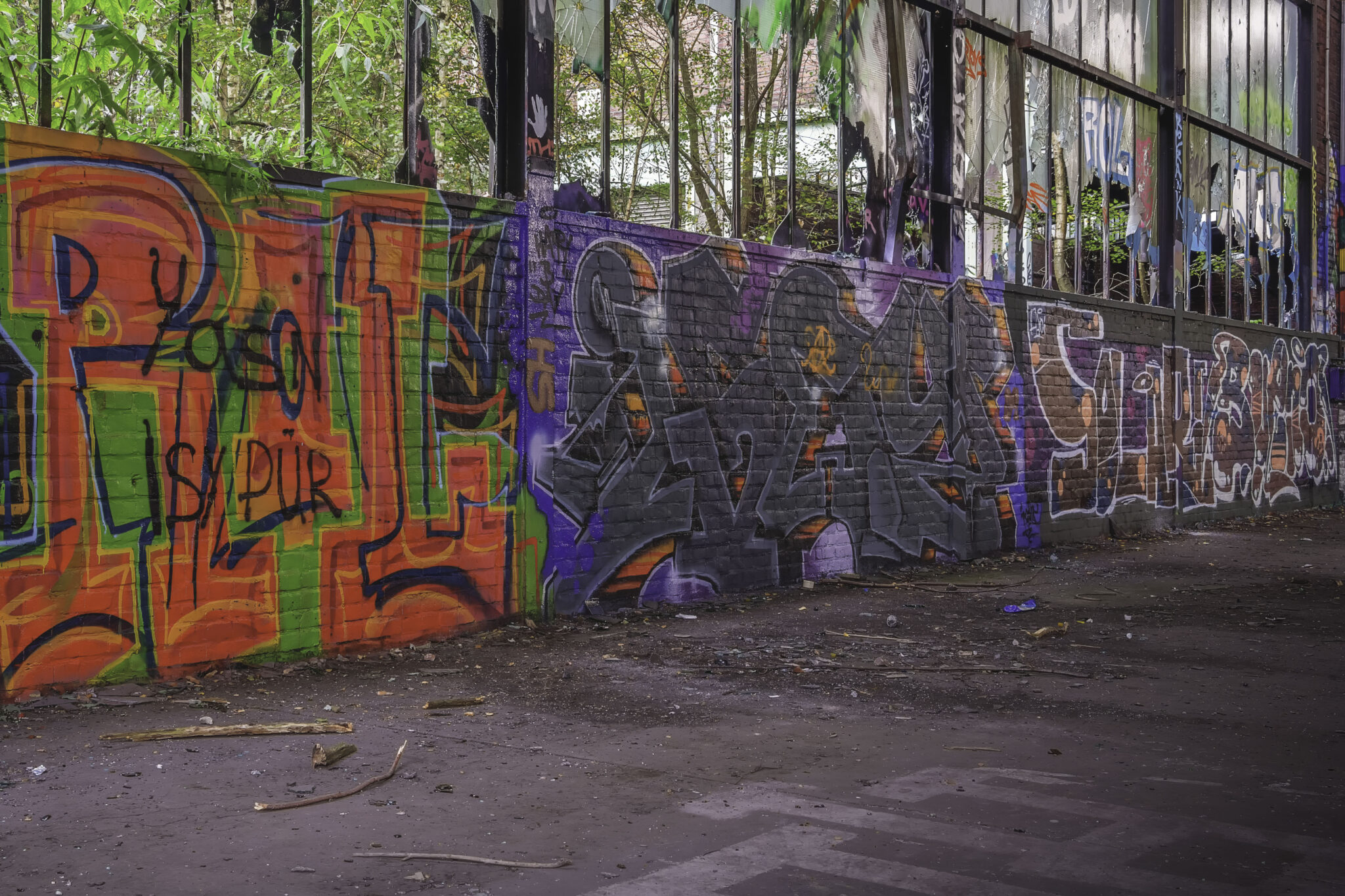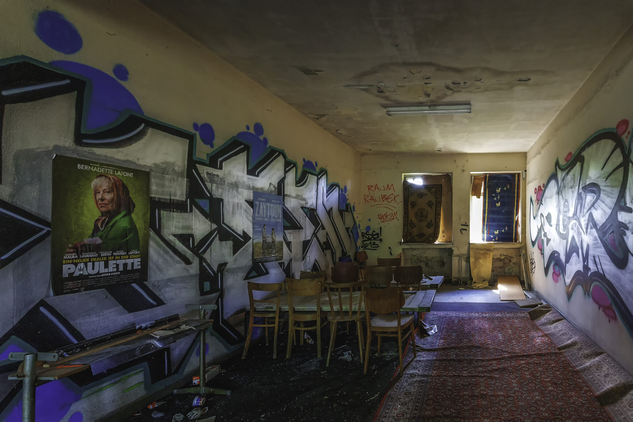 Während meiner Erkundung begegnete ich mehreren Graffiti-Künstlern, die gerade dabei waren, neue Kunstwerke zu schaffen. Eine kleine Gruppe von Jugendlichen hatte sich eine Ecke der Halle als improvisierten Treffpunkt eingerichtet, ein paar alte Stühle und Tische standen herum. Auf einem der Wände prangten Poster alter Filme, was dem Ort eine fast heimelige, aber dennoch surreale Stimmung verlieh.