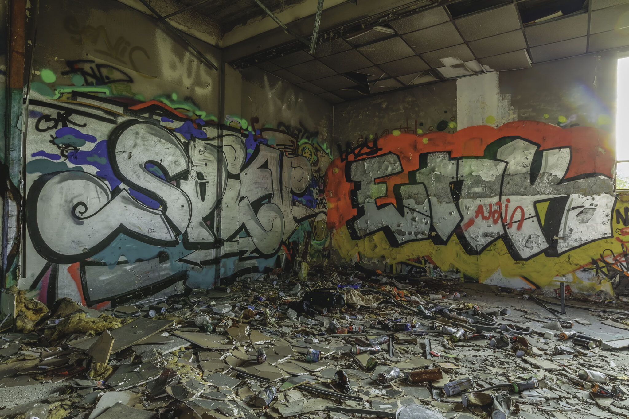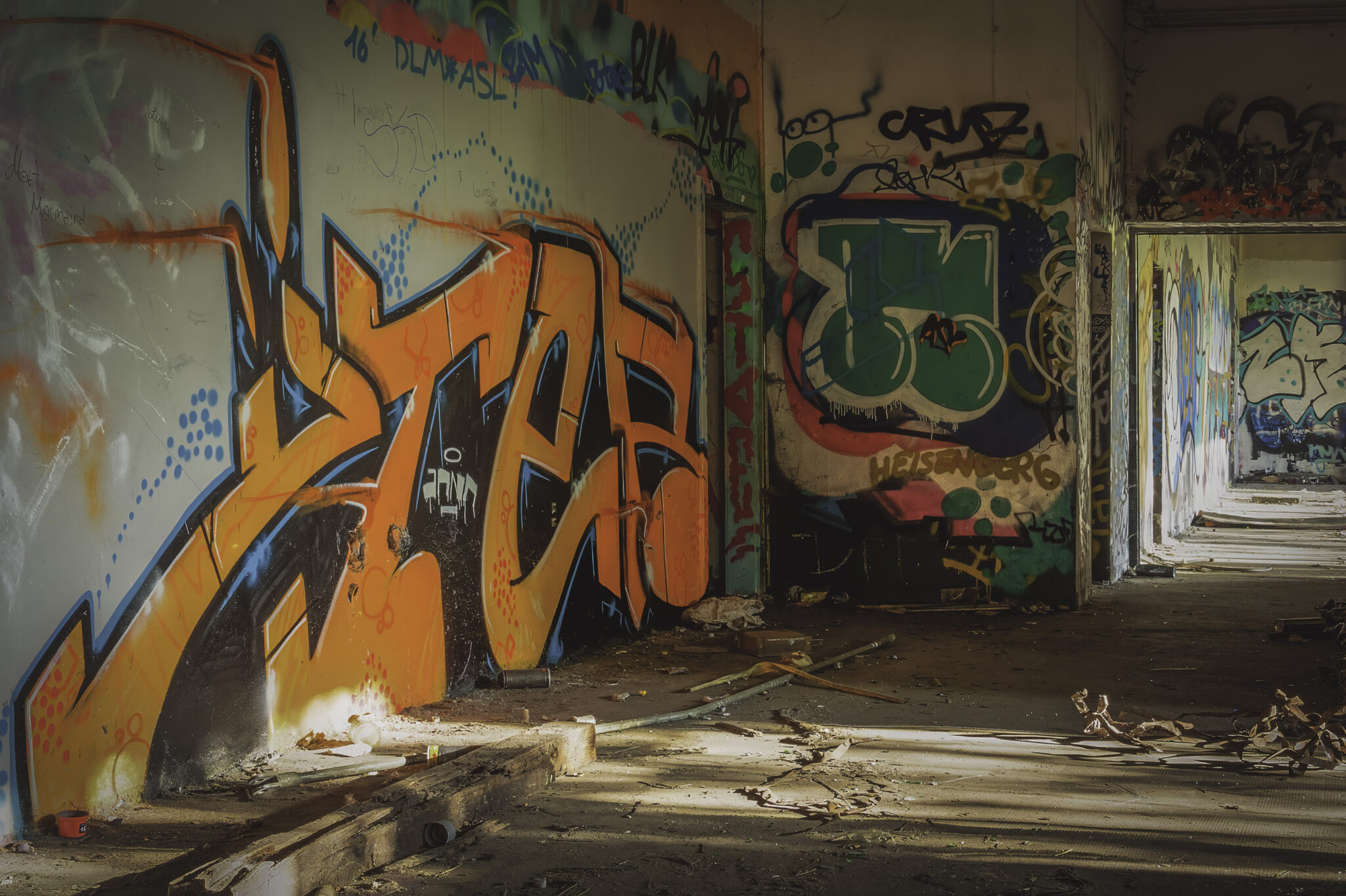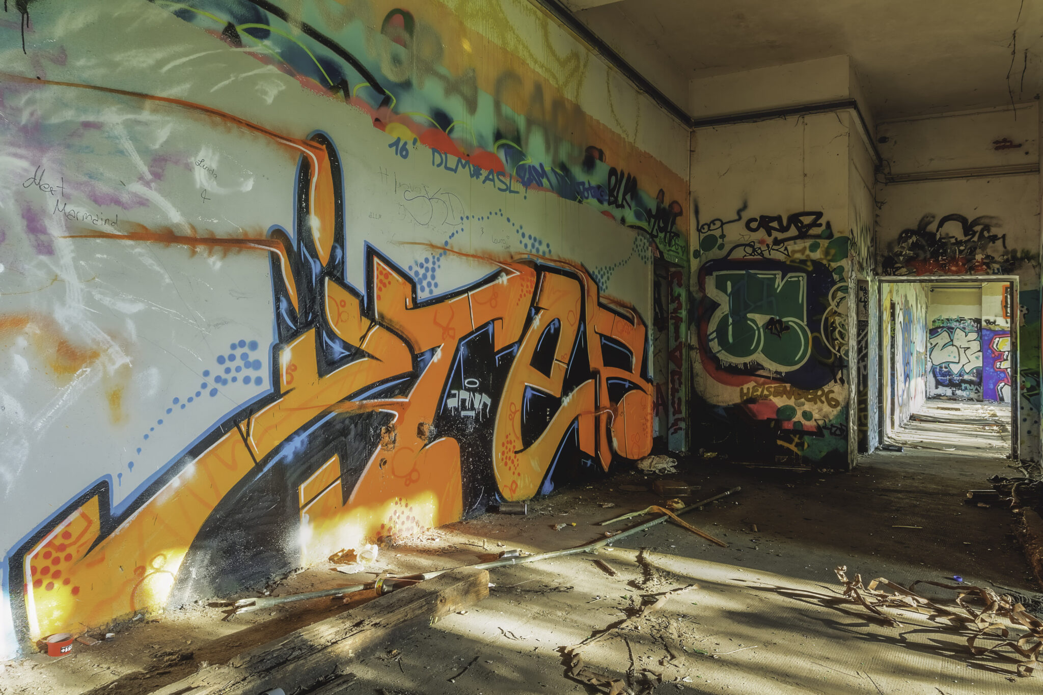Während meiner Erkundung begegnete ich mehreren Graffiti-Künstlern, die gerade dabei waren, neue Kunstwerke zu schaffen. Eine kleine Gruppe von Jugendlichen hatte sich eine Ecke der Halle als improvisierten Treffpunkt eingerichtet, ein paar alte Stühle und Tische standen herum. Auf einem der Wände prangten Poster alter Filme, was dem Ort eine fast heimelige, aber dennoch surreale Stimmung verlieh.