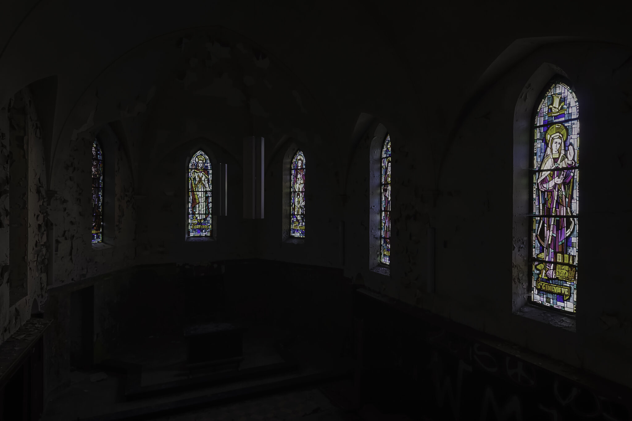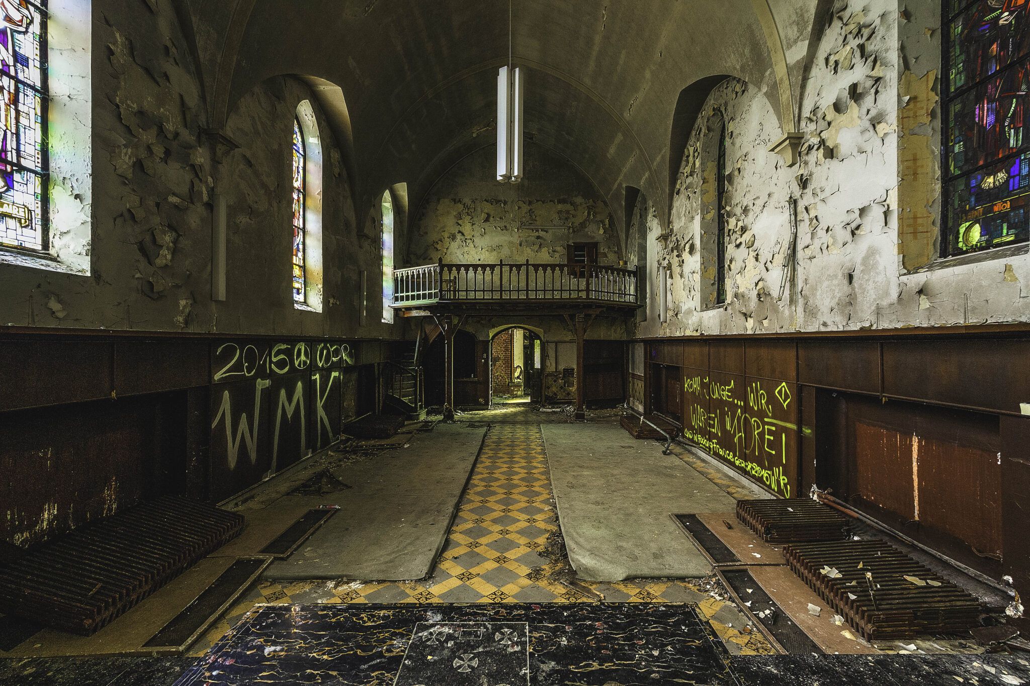 Das Innere der Kapelle war ein schockierender Kontrast. Die bunten Glasfenster, einst kunstvoll gestaltet, ließen farbiges Licht in den verfallenen Raum strömen. Doch wo einst Bänke standen, lagen nun Trümmer und Graffiti – eine verstörende Mischung aus Sakralem und Profanem. In einer Ecke des Anbaus stand ein verlassener Sessel, ein Symbol menschlicher Spuren in einem Raum, der eigentlich der Spiritualität gehörte. Es war bedrückend und faszinierend zugleich.
