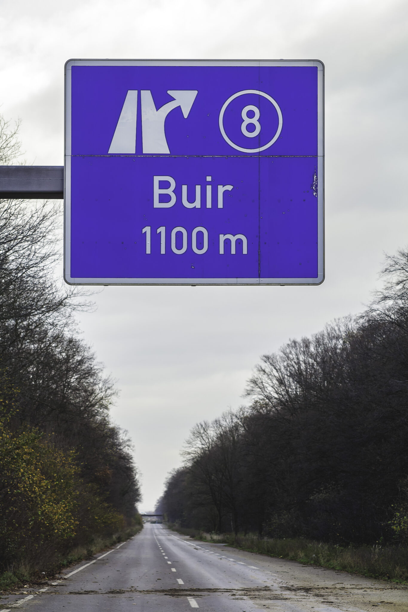 Bereits bei der Annäherung fällt das große blaue Autobahnschild ins Auge: „Ausfahrt Buir – 1100 m“. Doch statt Verkehr herrscht hier unheimliche Ruhe. Die Fahrbahn, einst glatt und von Tausenden Reifen gezeichnet, zeigt heute deutliche Spuren der Natur. Innerhalb weniger Jahre nach der Stilllegung begann die Natur, den Raum zurückzuerobern, und mittlerweile bedecken Moose, Gräser und junge Bäume weite Teile der ehemaligen Asphaltfläche.