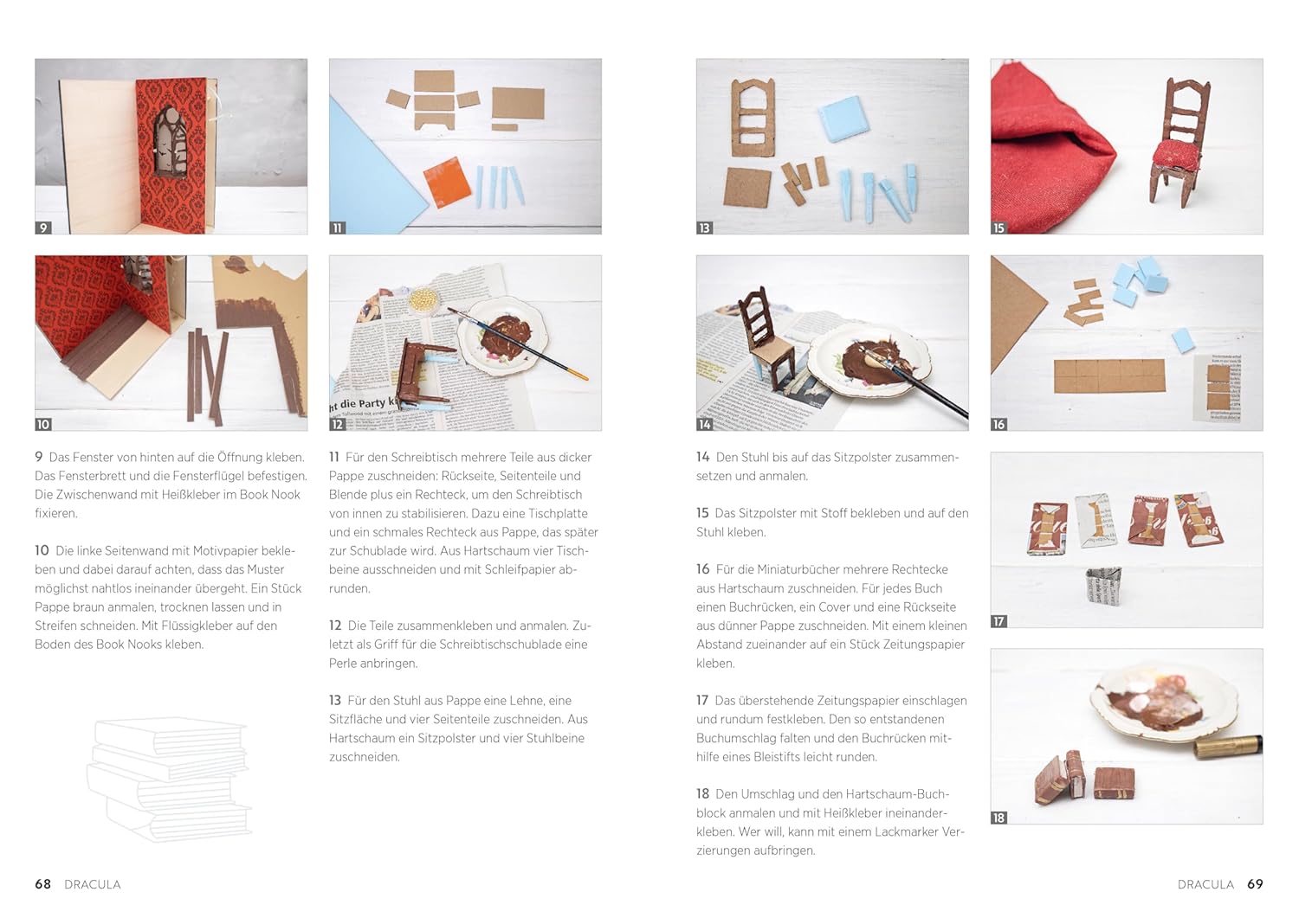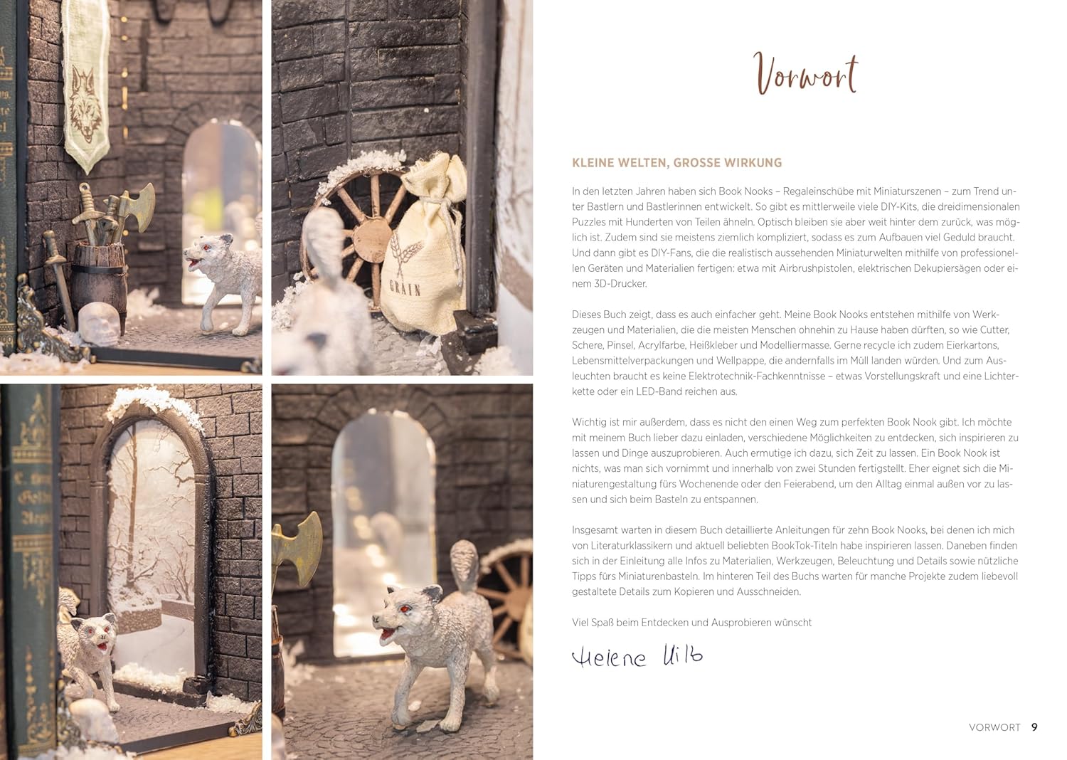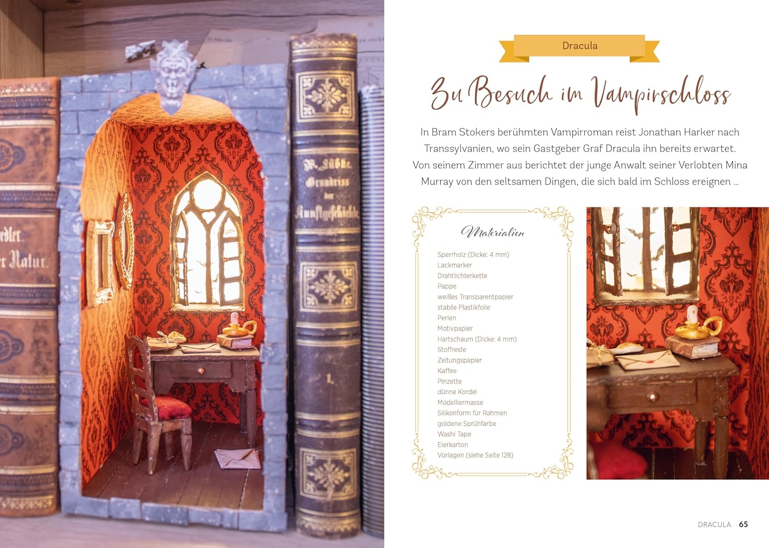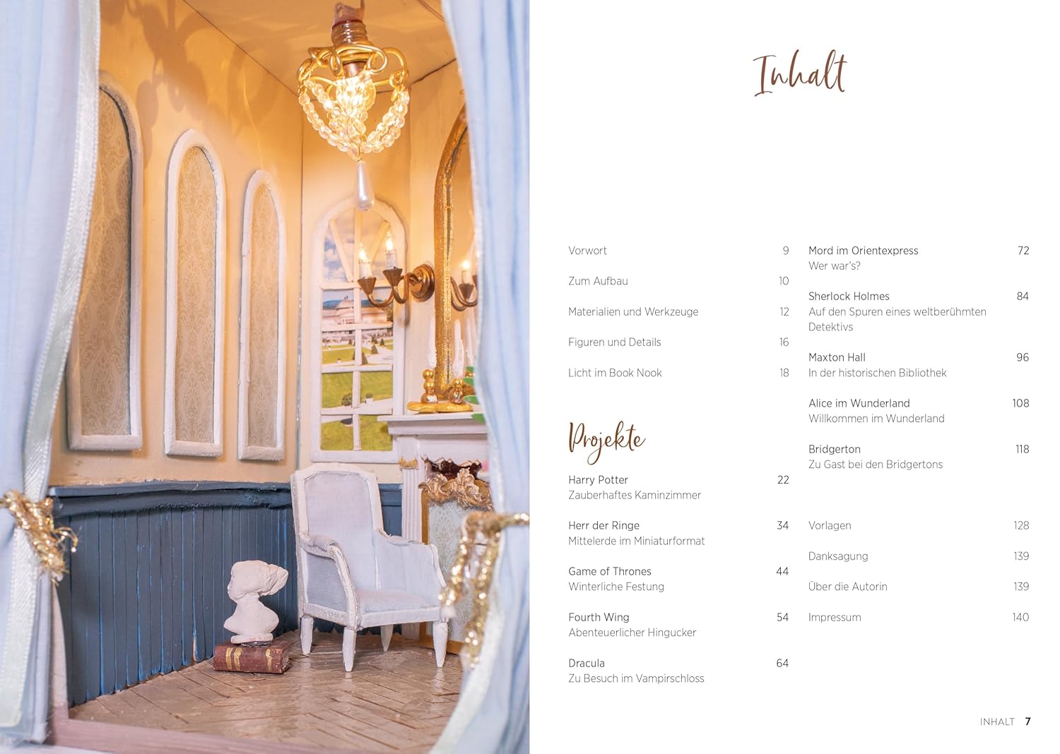 Das 144-seitige Buch liefert zehn vollwertige Projekte für Book Nooks, also Miniaturwelten, die man ins Bücherregal zwischen zwei Buchrücken einbaut. Dabei reichen die Themen von klassischen Literaturwelten bis hin zu Fantasystädten oder detailverliebten Straßenzügen.